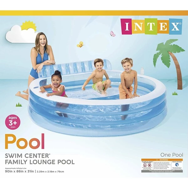 Надувной бассейн СЕМЕЙНЫЙ достаточно большой и вместительный для всей семьи. Бассейн оснащен встроенным надувным сиденьем и спинкой. Пока дети плещутся в воде, родители могут наблюдать за ними с мягкого диванчика. В стенках бассейна предусмотрены два отверстия для напитков. Высота бассейна 76 см, он предназначен для детей от 3 лет. Надуть бассейн можно с помощью любого насоса Intex, который приобретается отдельно. Для удобства, в бассейне есть два надувных клапана, а также сливной клапан в дне бассейна.