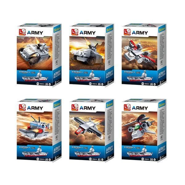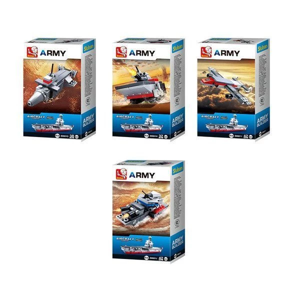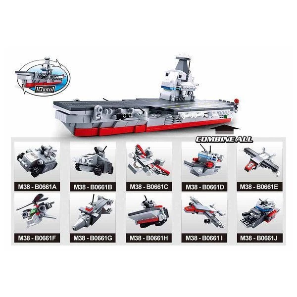 Необычный конструктор Sluban Army “Авианосец”, представлен в ассортименте. Каждый набор из 10 представляет собой интересную и уникальную модель самолета для сборки, собрав все модели вы сможете их соединить в один большой авианосец.