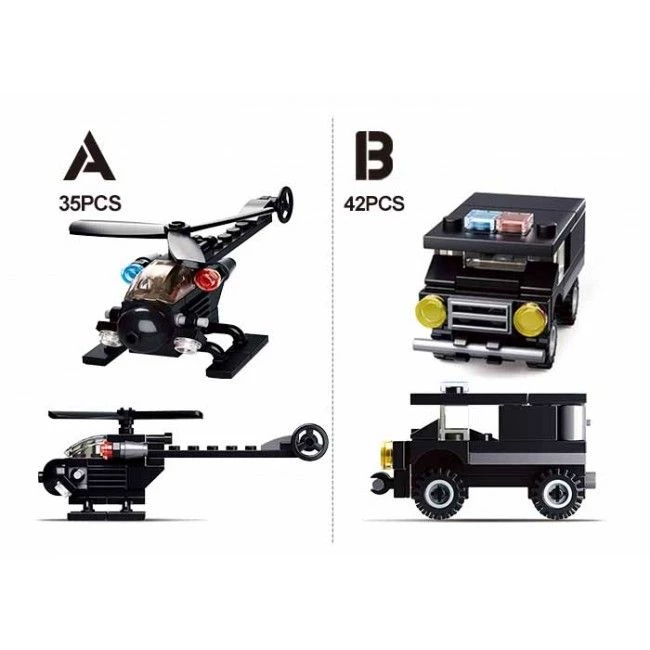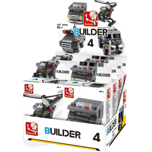 Конструктор Builder от Sluban представлен в ассортименте. Каждый комплект из 4 представляет собой интересную и уникальную модель полицейского транспорта для сборки.