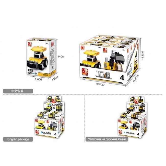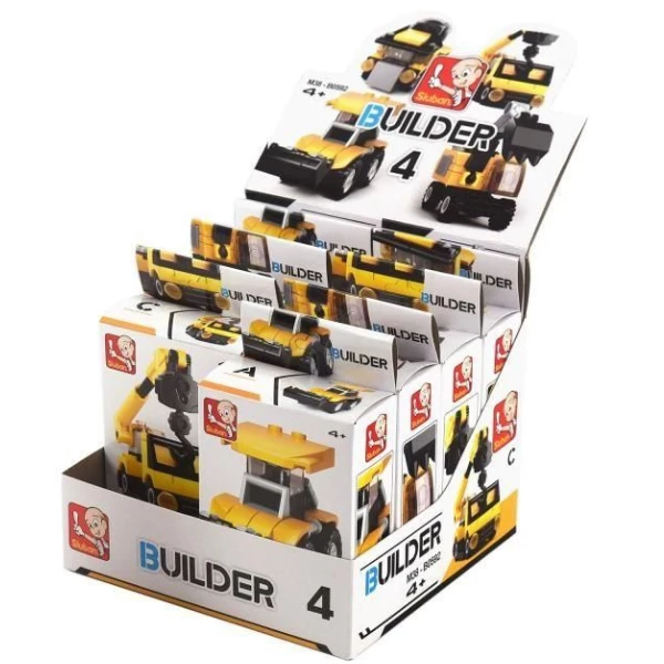 Конструктор Builders от Sluban представлен в ассортименте. Каждый комплект из 4 представляет собой интересную и уникальную модель строительного транспорта для сборки.