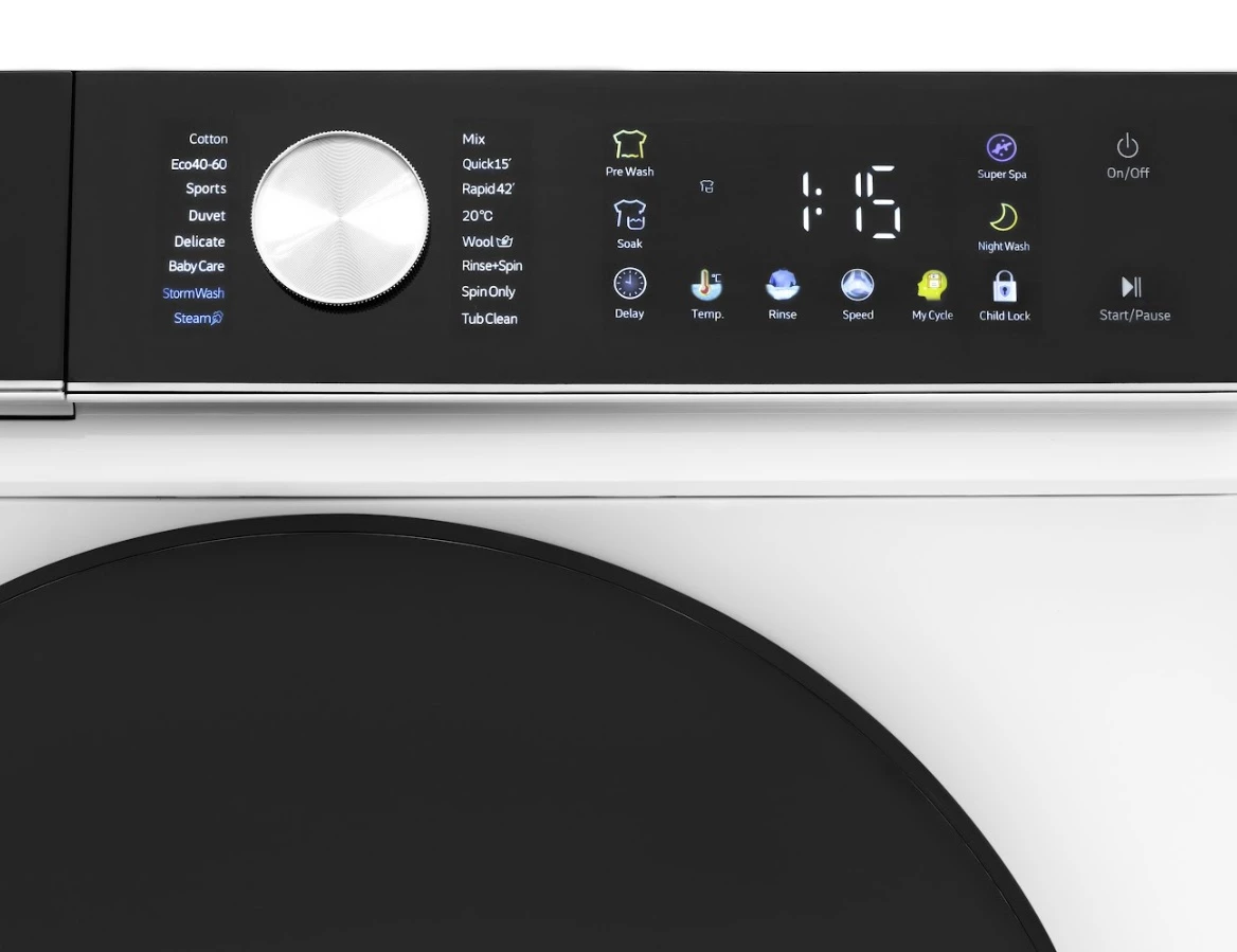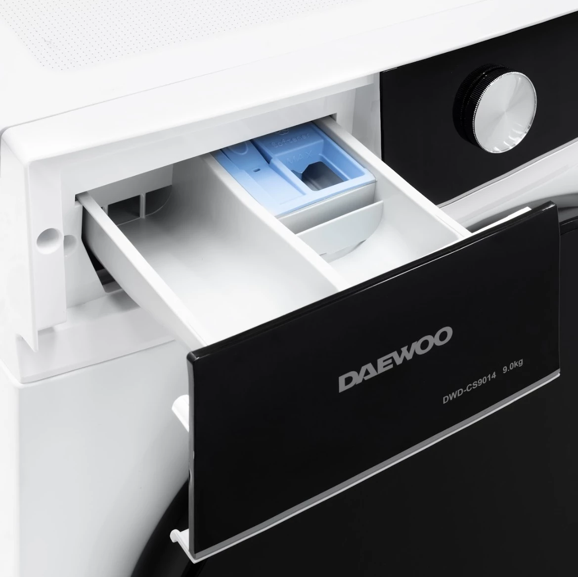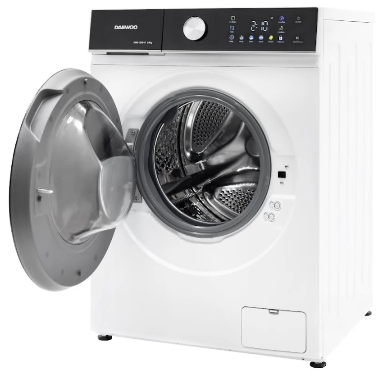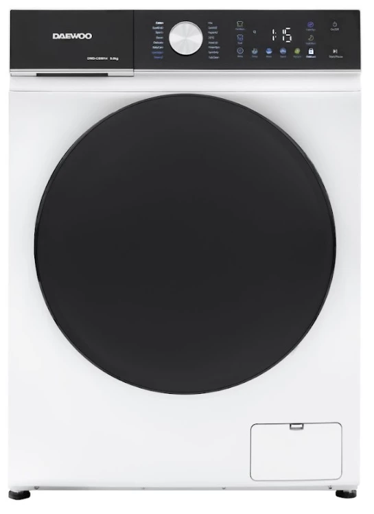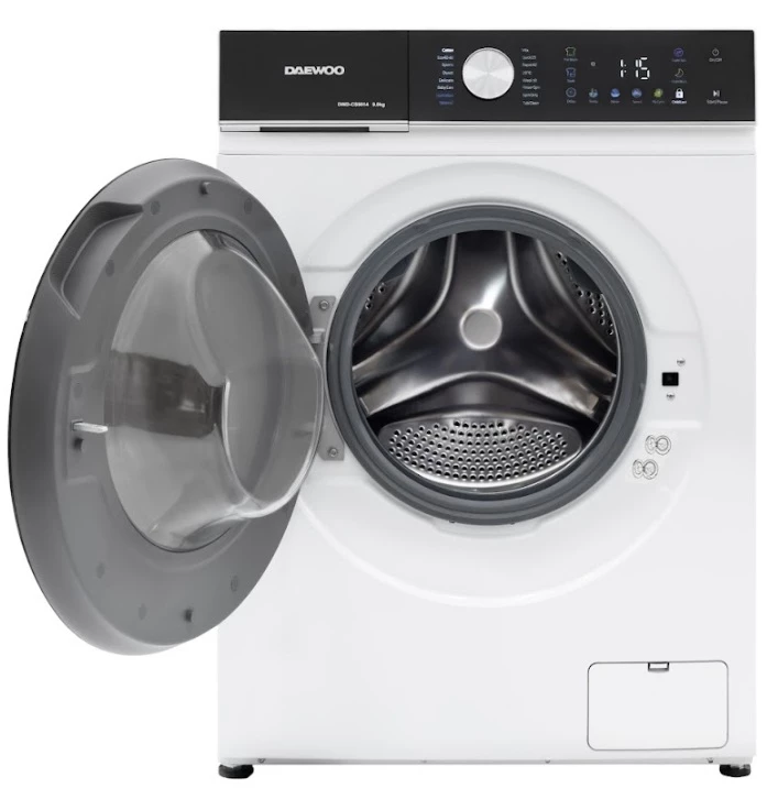 Masina de spalat rufe Daewoo DWD-CS9014, 9 kg / 1400rpm, 60cm, clasa A, motor inverter, Display, Panou negru + usa dubla neagra, 16 program, Alb