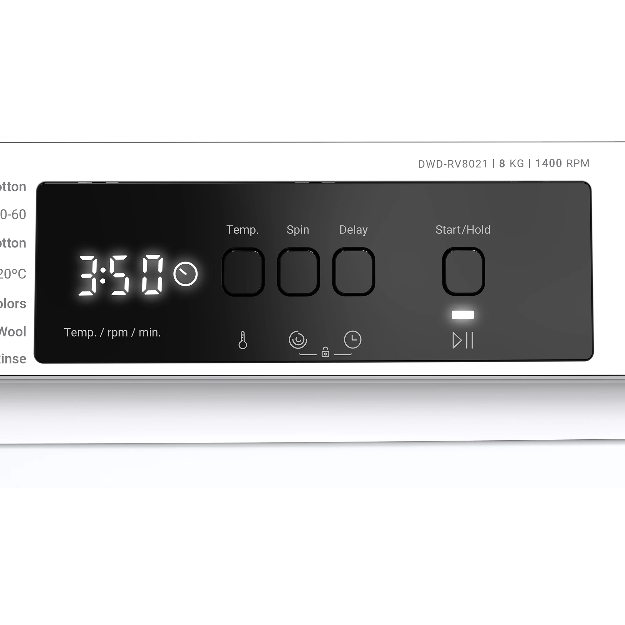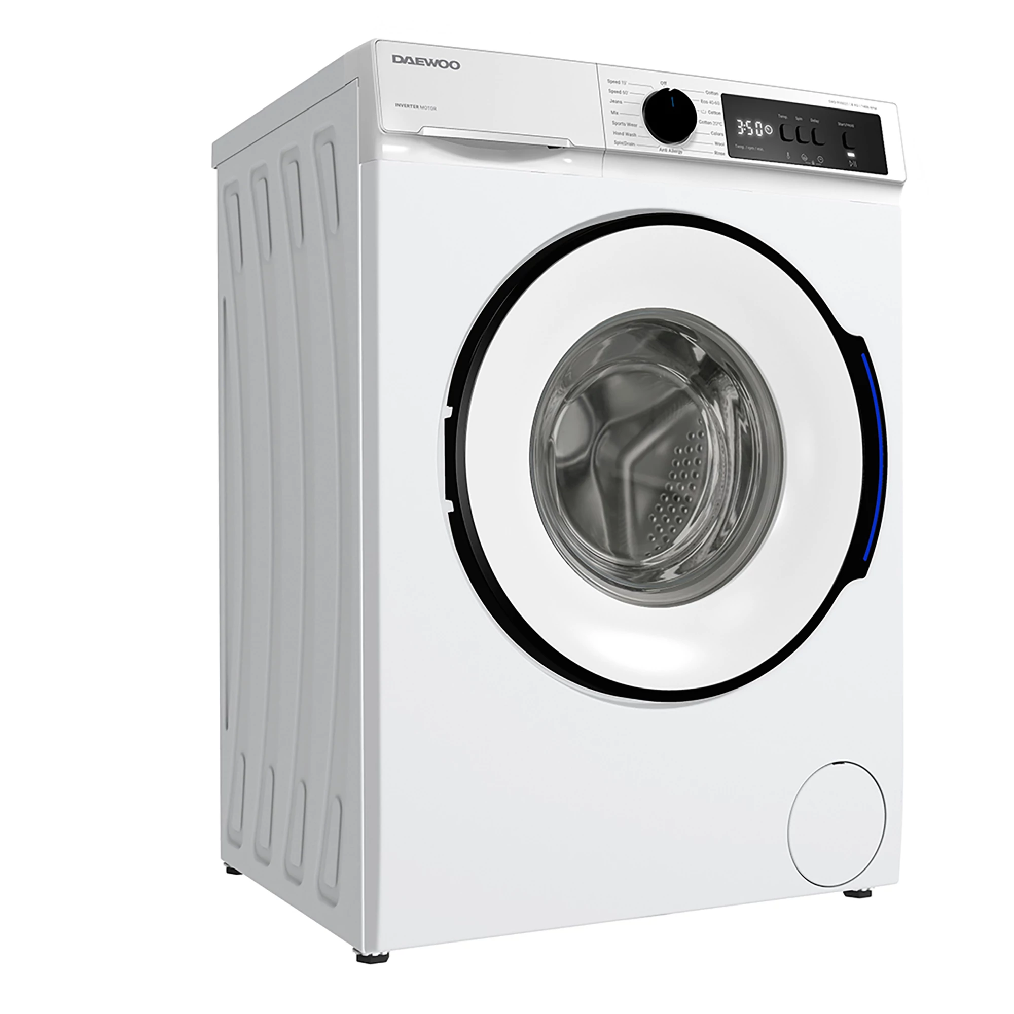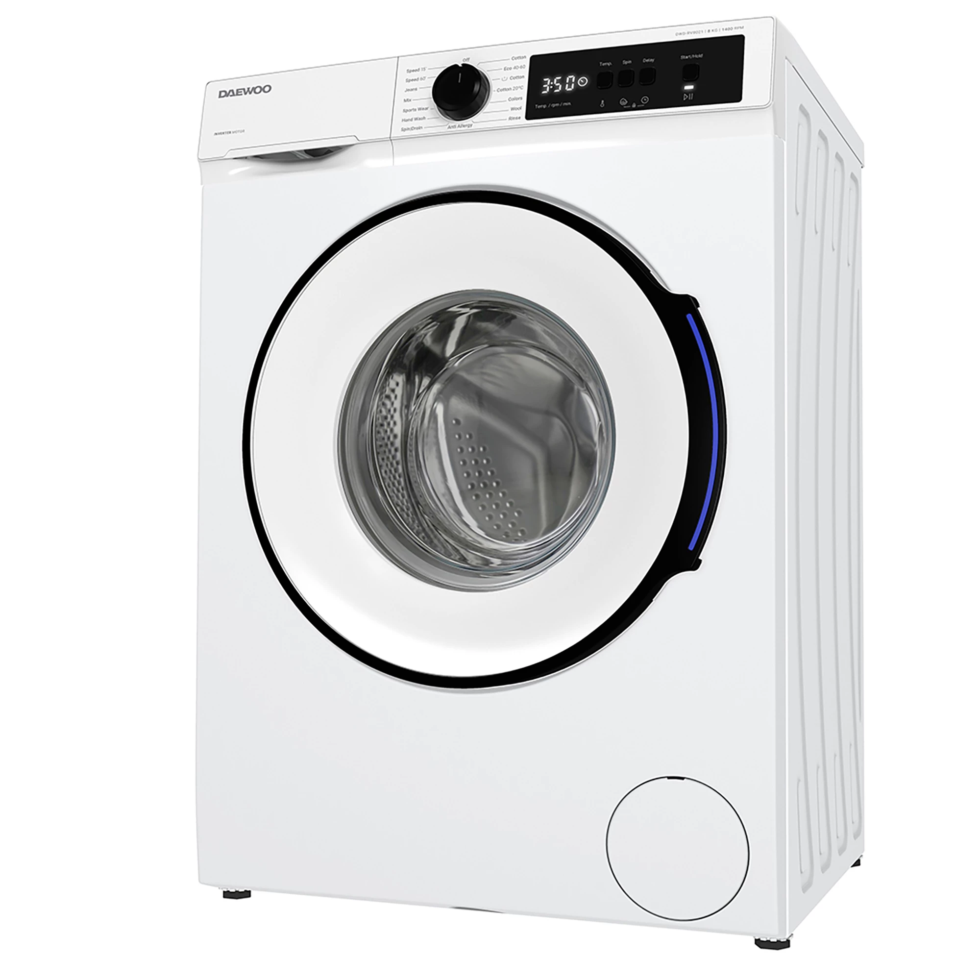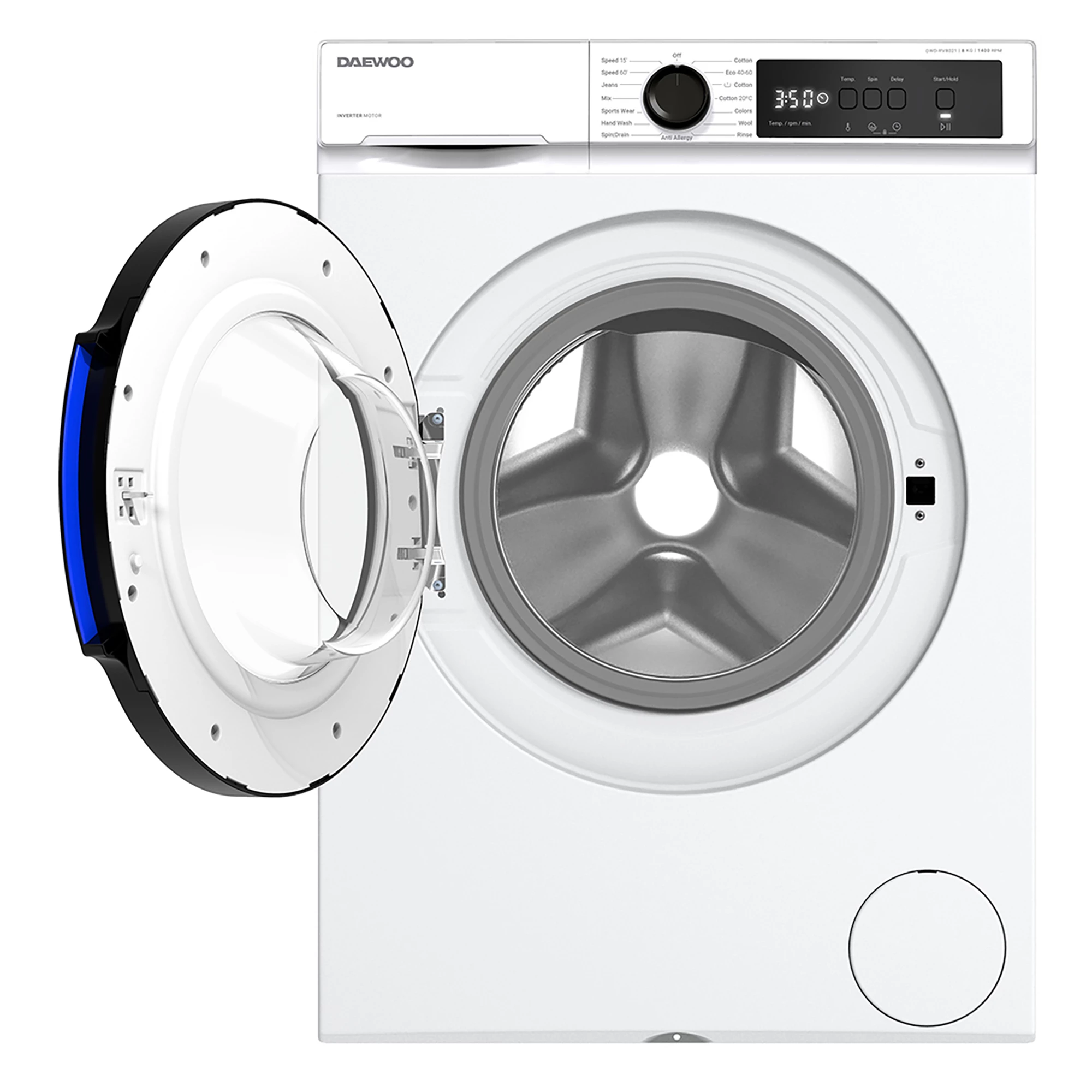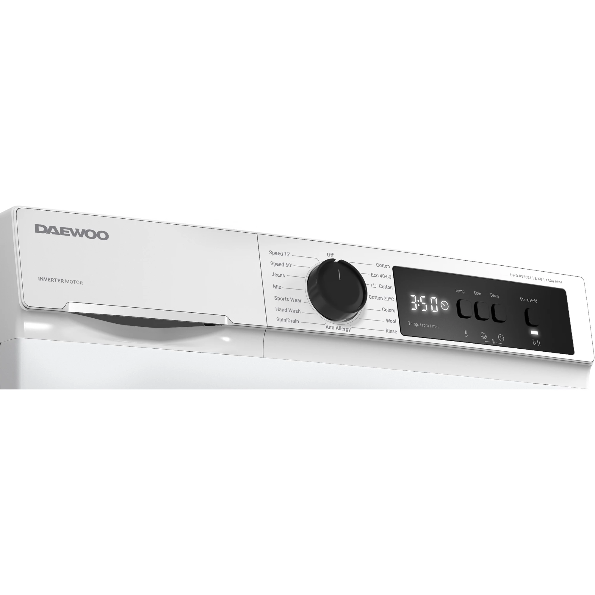 Masina de spalat rufe Daewoo DWD-RV8021, 8 kg / 1400rpm, 53cm, clasa A, motor inverter, Display, buton rotativ negru + usa cu inel negru, 15 program, Alb