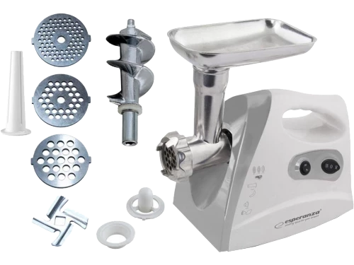 Meat Grinder Esperanza MEATBALL EKM012E 600W stainless steel knife for long time use, metal spiral drive, 3 discs with different diameter holes (2,7mm, 4mm, 8mm), nozzle for making sausages, nozzle for making kebbe, gray
