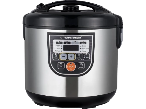 Multicooker Esperanza COOKING MATE EKG011 Black, Power: 860W, Inner pot capacity: 5L, Inner pot coating: non-stick, Steam vent cup: removable, 11 programmable functions, Preset time: 10 minutes – 24 hours, Cooking time adjustable, Stainless steel housing, Accessories: measuring cup, rice scoop, soup ladle, Steam basket, inox