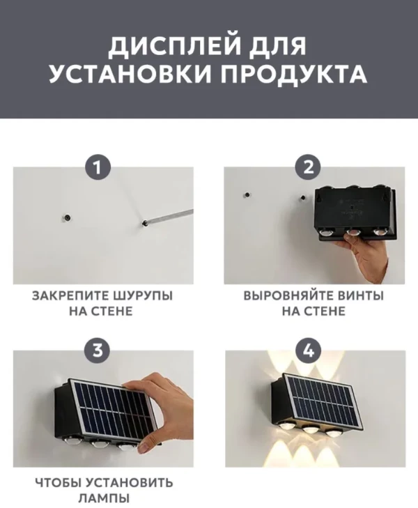 Корпус из прочного ABS-пластика защищён от влаги и пыли (степень защиты IP65) и выдерживает температурные колебания от -20°C до +50°C. Установка проста — можно прикрепить к стене, забору или фасаду дома с помощью шурупов или двустороннего скотча.