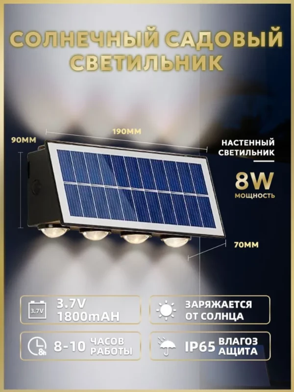 Современный садовый светильник на солнечной батарее — это простое и экологичное решение для уличного освещения без проводов и затрат на электричество. Мощность 8 Вт обеспечивает яркий свет, а встроенный аккумулятор ёмкостью 1800 мАч позволяет светильнику работать до 10 часов после полного заряда.