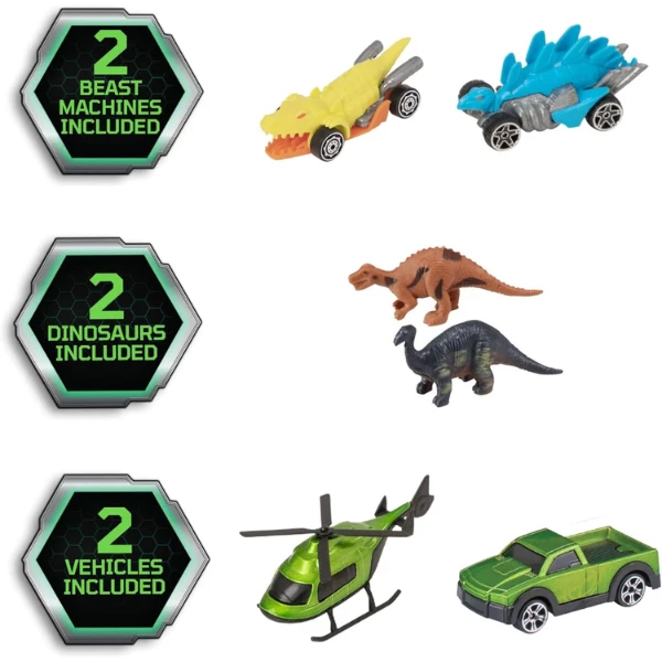 Динозавр может стоять на 3 различных высотах. Все включенные автомобили имеют масштаб примерно 3 дюйма. Характеризуются высококачественными деталями из литьевого металла и независимыми вращающимися колесами.
