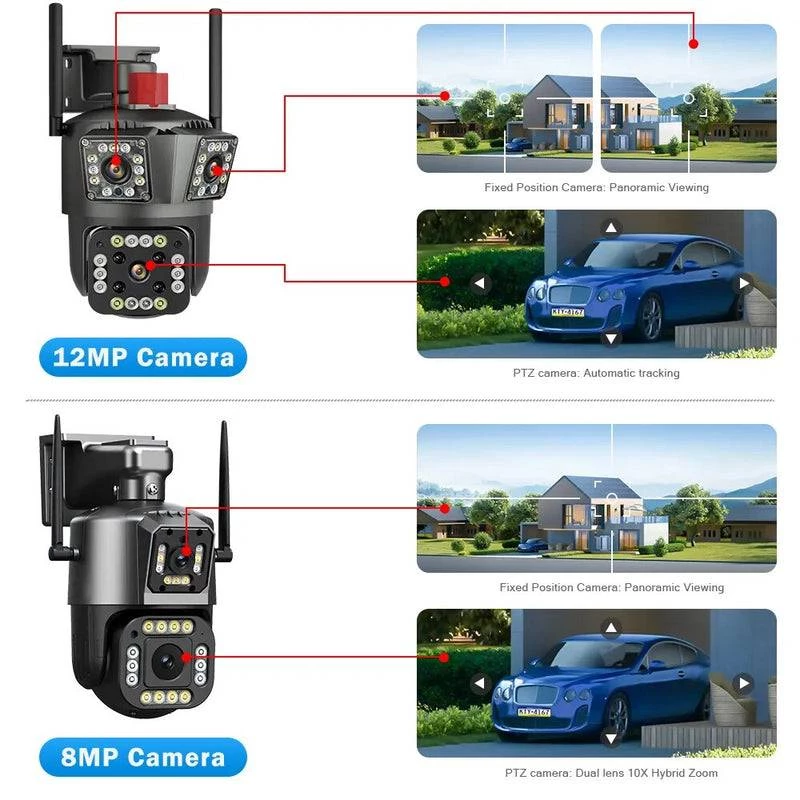 Эта Wi-Fi камера видеонаблюдения обеспечивает мониторинг в реальном времени с разрешением 3K, оснащена двумя объективами по 6 МП каждый. Антенна с усилением 5 dBi обеспечивает прием сигнала на большие расстояния. Камера оборудована ИК и белыми светодиодами, обеспечивающими четкое изображение вне зависимости от времени суток. Два основных объектива работают независимо, позволяя получать детализированные изображения с разных углов и охватывая широкую зону. Дополнительный объектив, расположенный в верхней части камеры, предназначен для дублирования изображения одного из основных объективов.
