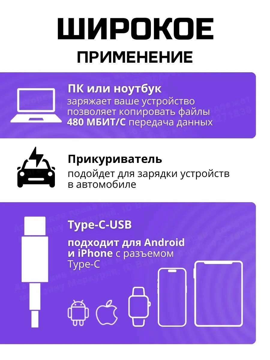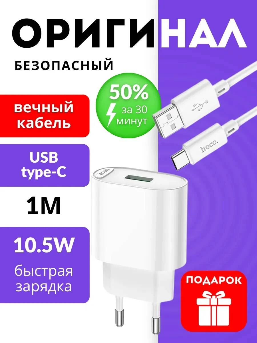 В комплект входит прочный и гибкий кабель Type-C длиной 1 метр, подходящий для современных Android-устройств, планшетов, повербанков и даже iPhone с разъёмом Type-C.